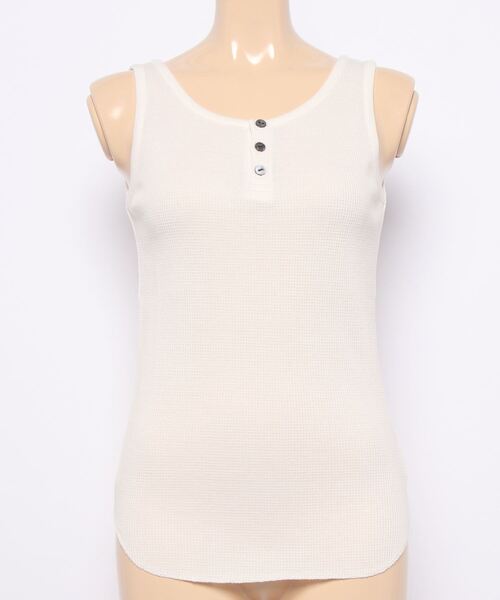 ワッフルカットソー生地の前後2WAYタンク。 ヘンリーネックを前にしても、クルーネックを前にしても、 どちらも着られる嬉しい2WAY仕様。 シンプルなデザインでも、きちんと感が出るクルーネック。カジュアルになりすぎず上品に着こなしもできます。