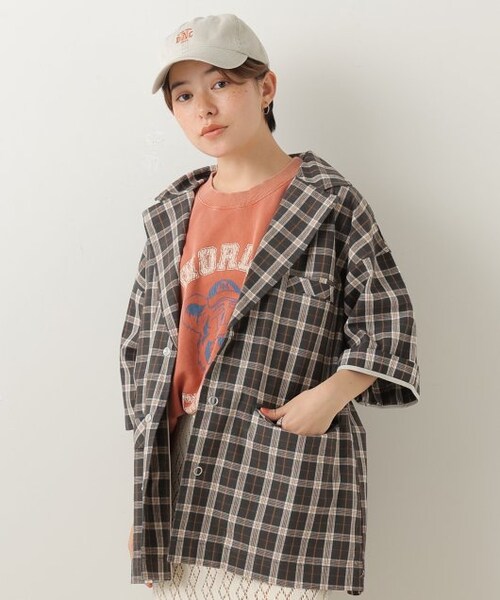 ジャケットはひじが隠れる位の袖丈で折り返して調節も可能。無地のカラーパンツや、フレアスカートとも好相性。開襟シャツの延長のような着こなしもおすすめ◎リングドットボタンを使用しているのが今年らしい印象に。めくったところのパイピング等配色になっているのもさりげないポイントです◎綿素材の涼し気なチェック生地でのパンツ[223319390]と合わせたセットアップとしての着こなしもおすすめ。※撮影環境により実際のカラーとやや異なる場合がございます。画像をご参照の上、ご了承頂けますようお願い致します。■モデル:藤通マナ[身長154cm/着用サイズFREE]ウエスト59cm/ヒップ80cm・伸縮性: なし・透け感: なし・裏地: なし・光沢感: なし・生地の厚み:薄い