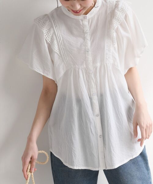 肩のフリルが愛らしいバンドカラーコットンブラウス 肩に羽のようなフリルをあしらったガーリーブラウス。 スカラップのレースが大人可愛い装いにぴったりな1枚になってます。 背中までフリルをつけてバックスタイルも表情をプラス。 ピンタックをV字に施しててすっきりとした印象に。 バンドカラーが上品で女性らしい装いに♪ ※再入荷の場合、生産時期が異なるため色・素材・サイズ・デザイン等多少異なる場合がございますので予めご了承ください。 裏地なし 伸縮性なし 薄手 前開きボタン留め インド生産 (インド製品特有の色柄、風合いのため多少の色むら、織りキズ等は商品の特徴の一つですので、予めご了承ください) 洗濯:手洗い可 ▼お気に入り登録でお得がいっぱい▼ ~商品をお気に入り登録~ 再入荷・ラスト1点・セールの通知を受け取ることができます! ~ブランドをお気に入り登録~ 《rps》の新商品・再入荷情報をいち早くお届け!