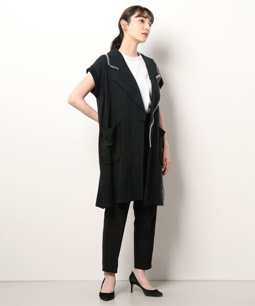 麻100%の気持ちの良いリネン素材を使用。 高級感があり、さらっとしていて肌が喜ぶ素材です。 製品洗いをかけて、ラフな風合いを増した gommeおすすめのシリーズです。 カーディガンのように羽織りたいノースリーブジャケット。 テーラーカラーですが堅苦しい印象はありません。 後ろ部分にはストライプをミックスし、襟元にはステッチ刺繍。 細部にまでこだわりつくした一着です。 コーディネートがシンプルになるこれからの季節にも、 こんなアイテムを羽織ればおしゃれ度アップ間違いないですね。