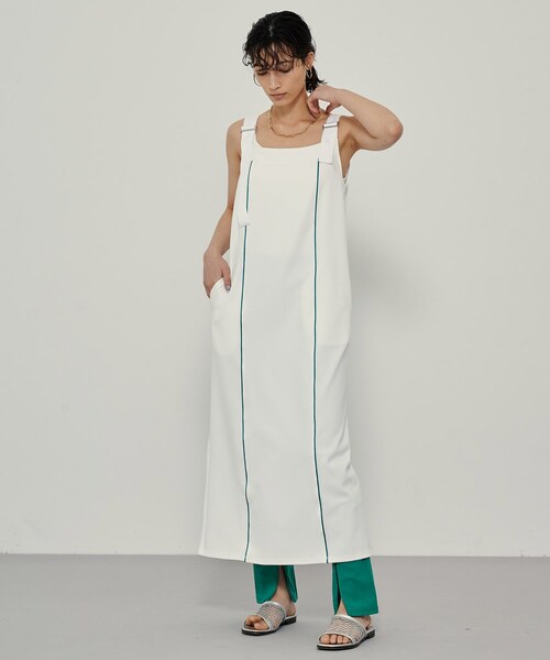 デザイン夏必須なサロペットワンピース。ジャージ素材なので、伸縮性があり着心地も良いです。肩紐の調整ができるので、短くして1枚着をしたり、長くしてインナー合わせのレイヤードも楽しめる一枚です。パンツ合わせもおすすめです。素材肌なじみのよい柔らかで伸縮性のあるジャージーです。光沢感もあるので、上品な生地に仕上がっております。