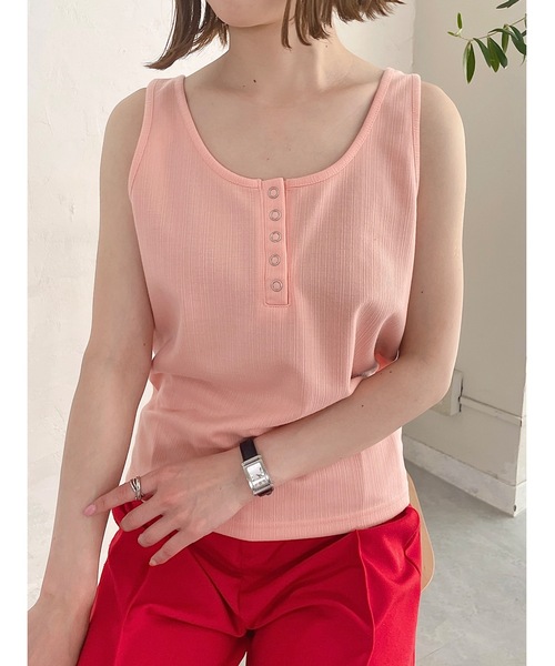 前後2wayできることが出来るカラータンクトップ。ボタン側を前にすればカジュアル感のある雰囲気に。ボタンの付いている側を後ろにすれば、深めに開いた背中がトレンドライクで◎重ね着のインナーとして使えば、ちらりと色が見えてかわいいです♩・・・・・・・・・・・・・・・・・・・・・・・・・・・・・・・・・・・・・・・・・・・・・・・◆アイテム詳細素材・・・ポリエステル96% ポリウレタン4%透け感・・・なし生地の厚さ・・・普通伸縮性・・・あり裏地・・・なし・・・・・・・・・・・・・・・・・・・・・・・・・・・・・・・・・・・・・・・・・・・・・・・◆サイズ感リブ素材なので伸縮性があり、体形を選ばず着ていただきやすいです。インでもアウトでも使いやすい丈感。首元は、ボタンの付いていない側が少し深めのUネックです。◆スタイリングシャツやカーディガンをサラッと羽織れば、あっという間に夏のカラーコーデに。脇が高めなので、脇の開いたトップスなどのインナーとしてもおすすめです。