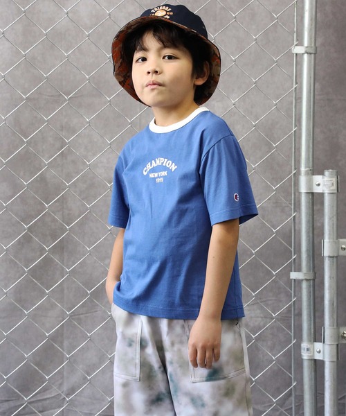 ChampionのカレッジプリントTEEです。プリント柄がレディースと同じとなっており、親子連動商品となります。子供らしくリンガー配色パターンのデザインとなります。