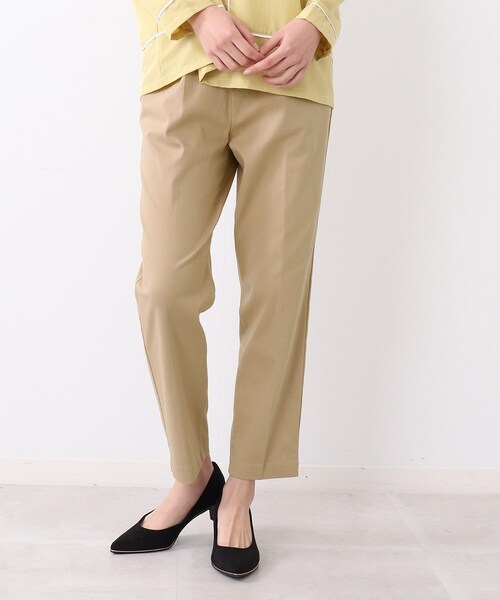 ■ポイント・ストレッチが心地良い。・ウエストゴムで履きやすさ◎・センタープレスで脚をきれいに見せてくれる!・洗濯機で洗えてお手入れがラク。■デザインハイパーストレッチ素材で楽ちんに動ける穿き心地が魅力のテーパードパンツです。裾に掛けて細くなるシルエットとセンタープレスで脚長見え◎フロントにタックを入れることでお腹周りをスッキリ見せてくれます。ウエスト後ろはゴム仕様なので、楽に穿いて頂けます。後ポケット付きも嬉しいポイントです。※ポケット数:横×2 横×2■スタイリング上品さと清潔感があり、キレイなシルエットのテーパードパンツ。ブラックとサンドベージュはオフィスカジュアルや学校行事にもおすすめ。ライトグリーンはコーデのポイントカラーにして取り入れて◎ベーシックカラーと合わせればコーデの幅が広がります。ギンガムチェックはカジュアルコーデにもフェミニンコーデにも着回し力のある1枚。■スタッフ着用コメント・スタッフA 身長:157センチ、体型:普通 着用サイズ:Mウエストゴムで楽に履けました。私が履くとフルレングスの着丈です。■生地、素材感生地感:しっかりとしたストレッチ素材触れた瞬間ひんやりする接触冷感機能付き。透け感:なし伸縮性:あり厚さ:普通裏地:なしその他:UVケア・接触冷感・マシンウォッシャブル機能付き※この製品は、太陽光線中の紫外線(UV)を通しにくくします。この効果は永久的ではありません。モデル情報:身長165cm B75 W59 H86 着用サイズ:02(M)店舗へのお問い合わせ商品番号:741-64012●製品寸法:02(M):W64~70cm H84cm 股下63cm 前股上32cm 渡り幅29cm 裾幅17cm03(L):W67~73cm H88cm 股下64cm 前股上32cm 渡り幅30cm 裾幅18cm04(LL):W70~76cm H92cm 股下65cm 前股上32cm 渡り幅31cm 裾幅19cm備考: