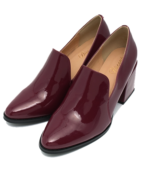 Discoat(ディスコート) つややかなエナメルがエレガントな足元えお演出♪珍しいスクエアの太ヒール、スマートな印象かつトラッドスタイルにもおすすめなポインテッドトゥもポイントに。絶妙なカッティングでソックスとのコーデもお楽しみいただけます。