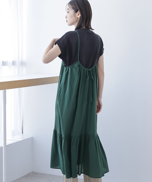 たっぷりとした、ボリューム感のあるティアードデザインのキャミワンピース。 透け感のあるやわらかな素材で、ロング丈でも軽い印象です。 華奢なストラップで女性らしい雰囲気に仕上げました。 【素材】 コットンボイルの軽い素材に、クリンクル加工をほどこした素材。 ランダムなシワ感が特徴です。 【スタイリング】 インナーはシンプルなTシャツやグラフィックTに、ボトムスはデニムやイージーパンツとのレイヤードがおすすめです。