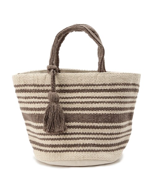 【デザイン】しっかりとした素材感のインド綿(コットン)を使用した温かみのあるトートバッグ。味のあるボーダー柄に、タッセルのモチーフを配したお洒落なアイテム。丸底のマチでコロンとしたフォルムが可愛らしく、ちょっとしたお出かけにも便利なサイズ感です。※ポケット数:内側×1店舗へのお問い合わせ商品番号:C70-04306●製品寸法:00:高さ22cm 幅(上部)34cm 幅(下部)25cm マチ23cm 持ち手上がり12cm 付属チャーム全長17cm 付属チャームモチーフH10cm 付属チャームモチーフW6cm備考:重量:約385g