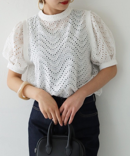 大好評につき半袖になって登場!品よく透け感を取り入れる夏服にぴったりなカットレースブラウス2022 S/S COLLECTION大好評を頂いた293-37001が半袖になって登場。特徴的なナミナミ模様のカットレースが目を惹くブラウス。袖部分には、つるりとしたサテン調素材をアクセントとして使用。さり気ない異素材切り替えでやり過ぎ感なくデザインをプラス。ボリュームスリーブで今季らしさを与えつつシルエットにメリハリを持たせスタイルアップ効果も。カジュアルなのにきちんと見えするので大人の女性にもオススメです。≪Styling≫きれいめのマーメイドスカートなどと相性◎。センタープリーツパンツと合わせればオフィスライクな印象へ。デニムでデイリーライクに着こなすのもオススメです。≪Fabric&Detail≫伸縮性・・・なし透け感・・・あり厚み・・・★★☆☆☆▼《お気に入り登録》のおすすめ▼【商品のお気に入り登録】気になるアイテムのハートマークを押してお気に入り登録すると完売カラーの再入荷通知やラストの通知、セール通知を受け取ることができます。【ブランドのお気に入り登録】新商品や再入荷など、いち早くブランドのお得な情報を受け取ることができます。ぜひご利用頂き、お買い物をよりお楽しみください。≪Brand introduction≫【She mo shelly / シーモシェリー】 365日HAPPYでいたい。おしゃれでいたい。そんな気持ちを抱いている女の子「Shelly/シェリー」をイメージしたブランド。彼女が毎日着ていたい服「she★mo shelly / シー モ シェリー」She(彼女)が mo(more/もっと) 輝く、そんな彼女にもっと会いたくなる服をコンセプトに 定番で使えるベーシックデザインからディティールに拘ったデザインまで、トレンド要素をバランス良く落とし込んだ商品ラインナップをご提案しています。※撮影場所により、実際の色味と若干異なる場合がございます。 あらかじめご了承くださいませ。
