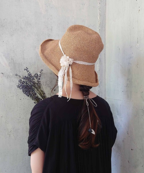 ・*:・ ペーパーハット*コサージュ付き・:*・ 今年もはるなつにぴったりな雑貨が届きました* ひとつひとつ丁寧にかぎ針で編み上げた、軽くて繊細なペーパーハット。 濃淡のあるペーパーを使うことで、 天然素材のような風合いのある質感に仕上がりました。 つばが広めで、つばの先には針金が入っているので 動きをつけることもできます。 なみなみにしてみたり、遊びがあるのもいいですよね♩ ナチュラルなベージュのハットは ホワイトのレースを巻きつけ、 ゆるりと垂れ下がるリボンにコサージュを。 レースとコサージュはすべて取り外しができ、 ハット本体は丸洗いができるのも嬉しいポイント* 汗をかきやすい夏のおでかけの必需品に!! 紅茶で手染めしたコサージュはミニサイズで お洋服に合わせて使うことも…* ヘアアクセサリーとしてもお使いいただけます。 ハットに巻きつけたレースやリボンは ネックレスのような使い方もできます。 日差しのある春夏には必需品のハットですが、 それ以外にも楽しみがあるのは、嬉しいですよね。 ぜひ、いろいろなアレンジをお楽しみください…* 本体:手洗い可能* (リボンやコサージュは取り外してください。) 【m.soeur(エムスール)*】 m.soeur(エムスール)は京都発のハンドメイドアクセサリーブランドです。 植物の美しさや生命力を表現しつつもお洋服に寄り添うような、ナチュラルでクラシカルなアイテムを 制作しています。 一点一点人の手で作り上げられる手作りのアイテムは温かみがあり、使い込むごとに味わいをましていきます。 ・*:・ ・:*・ ・*:・:*:・:*・ 【注意事項】 ※素材の特性上、色落ちが避けられません。摩擦、汗や水濡れにより、他のものに色移りする恐れがおりますのでご注意ください。 ※手作業のため、画像の商品と色、形、大きさが多少異なる場合がございますので、予め御了承下さい。 ※大変デリケートなお作りとなっておりますので、お取り扱いには十分ご注意下さい。 ※コサージュは手染めを施している商品となります。シミのように見える部分がある場合がございますが、染めの色となり、アンティークな風合いを出すためのものですので、一点一点発色が少々異なった仕上がりとなっております。 色落ちする場合がございますので水や雨等には十分ご注意下さい。