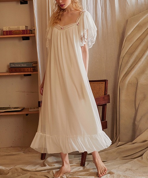 ストレスフリーなくつろぎの時間に寄り添うルームウェア。 ラグジュアリー感あふれるアイテム☆ 体系を選ばない、ゆったりシルエットのワンピースは 動く度に揺れるフリルがドラマティックなボリューム感を演出。 纏うだけで気分が上がり、おうち時間を楽しめる一着。