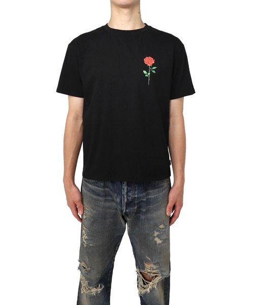 ローズフラワープリンテッド ハーフスリーブTシャツ 柔らかな風合いのコットン天竺を使用したショートスリーブTシャツ。 胸元にはシーズンを象徴するキーワードのグラフィックを、バックには、インパクトのある配色で大きくシーズンテーマををプリント。 身幅にゆとりのあるシルエット。
