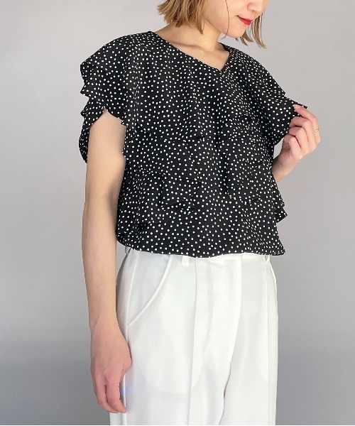 ラッフルカラーの大人可愛いブラウス。 さらっとした質感のドット柄生地を使用し、 これからの見た目にも涼しく着れる一枚です。 フロントや袖部分は2段重ねのラッフルデザインになっており、 立体感やひらりと揺れるシルエットが可愛いブラウスに仕上げました。 スカートインスタイルでフェミニンスタイルはもちろん、 テーパードやスラックスと合わせたキレイめスタイルにも◎ ※撮影場所や明るさにより 実際の商品と色味が若干異なる場合がございます。 ☆商品のお気に入り♡登録を押せば ”再入荷通知”や”残りわずか通知” 値下げのお知らせが届きます! お気に入りのブランド登録していただければ新商品入荷のお知らせも届きますので 是非登録してみて下さい。