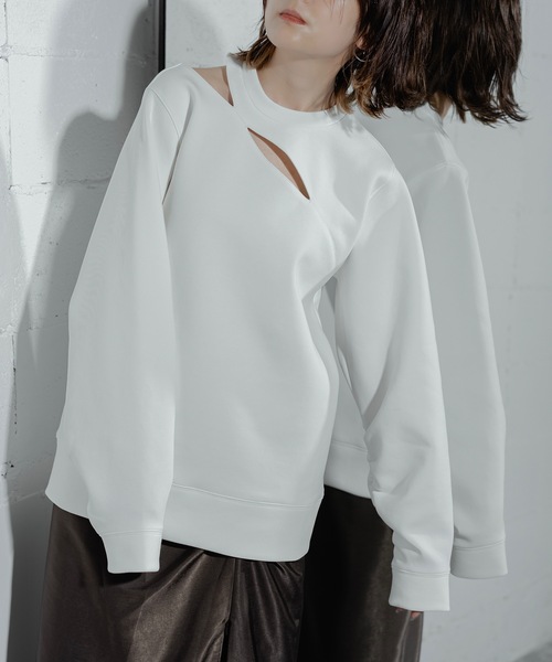 CUTTING SWEAT PO【商品説明】カッティング切り替えから見える肌見せがモード感漂うデザインスウェット裏毛とは異なる程よいハリ感のある素材が大人カジュアルな印象ビッグサイズでしっかりと袖丈もありメンズライクに着ていただけます袖口内側はギャザーを施しカーブのある立体的な袖の設計着るだけで抜け感の出るデザインスウェットです【コーディネート】綺麗目なスカートと合わせる大人モードスタイルカジュアル過ぎない素材のためワイドパンツ合わせも似合います【素材特性】綿素材の肌触りがよく高密度でハリのある表面が綺麗な素材を使用シワになりづらくハリ感が立体的なシルエットを作ります 吸水性・吸湿性に優れ、冬は暖かく着ていただけます【ケアについて】ご家庭でのケアが可能ですModel height:159cm■fabric綿 74%ポリエステル 20%ポリウレタン 6% ■made in china■size 着丈・・・69cm 身幅・・・54cm 肩幅・・・37cm 袖丈・・・63cm裾幅・・・50cm AMW-21A-18