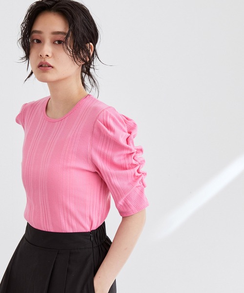 《洗える》おしゃれと実用性を両立してくれる華やかさ。コンパクトなサイズ感とスリーブの立体感が、女性らしさを引き立ててくれるデザインリブトップス◇2022春夏◇ ADAM ET ROPE' FEMME 【Material】 さらっとドライタッチな肌触りと、快適な着心地が魅力のコットン素材。程よいフィット感がありながらも身体のラインを拾いすぎない、縦ラインですっきり見えるランダムピッチのリブ素材。自宅で手洗い可能な点も魅力。 【Design】 袖山のギャザーに存在感を持たせた、五分袖のリブトップス。縦リブのすっきり感と袖のボリュームの対比が魅力的なシルエットを生み出し、女性らしい印象を与えてくれる一着。インでもアウトでもすっきりと決まる、ボトムに合わせやすいベーシックな着丈も嬉しいポイント。 【Color】 どんなボトムにも合わせやすいブラックとキナリに、デニムやベーシックカラーボトムと相性の良いきれいなグリーンとピンクを加えた、計4色展開。 【Styling point】 程よいフィット感のあるコンパクトなシルエットのトップスなので、ワイドパンツやスカートなど、ボリュームのあるボトムとの合わせが好相性。キャミワンピースのインナーにもおすすめ。 --------------- 裏地:なし 光沢感:なし 透け感:なし 伸縮性:あり 生地の厚さ:やや薄手 洗濯方法:手洗い --------------- ◇モデル情報 身長:163cm size:F