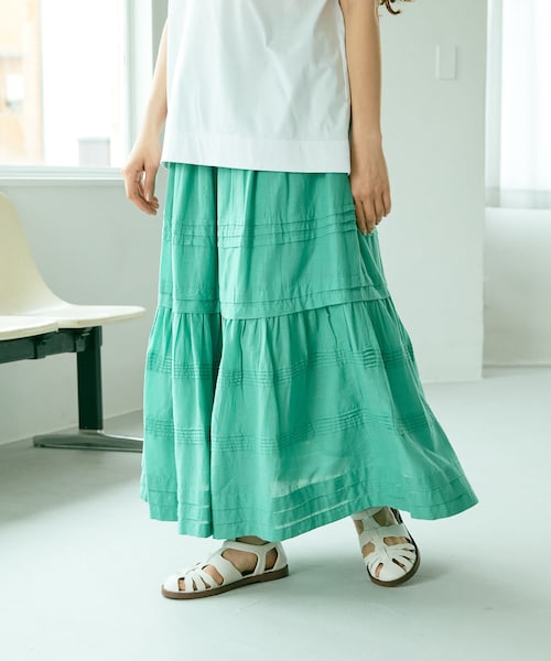 ピュアルセシン 2022 spring collection【Loose andclassical】リラックス感のあるルーズな着こなしや、今シーズンらしいミニマムでユーティリティな要素と素朴かつ巧みなハンドクラフト的なものとの融合させたスタイリングの提案◇ふわり広がるシルエットが素敵なコットンスカート◇●デザインエアリーなシルエットが可愛らしいコットンスカート。生地を重ねているからこそ出るボリューム感で、しっかり体型をカバーします。全色ペチコートが付いているので、透ける心配はございません。ウエストは総ゴム仕様になっており、そこから生まれるギャザーが動きをプラス。段々と表情があるデザインで華やかさを演出します。 カラー展開も5色と豊富で、スタイリングの差し色として活躍してくれる1着です。●カラー展開ホワイト/ブラックの定番カラーに鮮やかな、ピンク/グリーン/ブルーの3色を合わせた5色展開※ブルーのみWEB限定カラーです●素材吸水性・通気性が高く、夏でも快適な着心地が続きます。●スタイリングスタンダードなデザインなので、コンパクトなトップスと合わせたメリハリのあるスタイリングやロゴTシャツと合わせ、カジュアルダウンしたスタイリング、ブラウスと合わせたフェミニンなスタイリングなど、様々なスタイリングに取り入れていただけます。===============================透け感:なし裏地:なし伸縮性:なし光沢感:なし生地の厚さ:やや薄手【スタッフコメント】年齢:20代前半/身長:157cm/普段着用サイズ:Mサイズサイズ感:ウエストが総ゴムなので、とても楽な穿き心地でした。ペチコート付きで安心です。素材感:インドコットンを使用しております。柔らかくサラリとした清涼感のある肌触りです。===============================※撮影場所やお使いのモニター環境により若干お色味が異なる場合がございます。特にロケの撮影では明るく見える傾向にございます。※予約商品はサンプルで撮影をしております。若干の仕様が変更になる場合がございますので予めご了承の上ご注文くださいますようお願いいたします 。