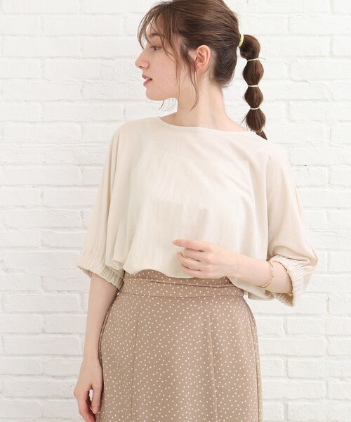 【藤本美貴さん着用】 ■デザイン 大人な抜け感のあるデザインプルオーバー。 袖口にゴムが入ったギャザーデザインとドルマンのゆるシルエットで気になる二の腕や体型をカバーしてくれます。 シンプルなデザインなので合わせやすく、暑い時期でも快適に着用していただける1枚です。 ■スタイリング 前をタックインしたときのサイドのドレープ感がキレイなので、ボリューム感のあるボトムともすっきりバランス良く合わせられます。 デニムなどとのシンプルコーデでも、袖のギャザーがコーディネートのさりげないアクセントに! ■着用コメント スタッフA(身長152 体重48 ):落ち感がある素材なので、小柄な私でも着られてしまうことなくすとんとすっきり着れました。 この素材感ならゆるずるコーデにも挑戦しやすいです! スタッフB(身長155 体重55 ):ちょうどお尻が隠れる丈です。 袖のギャザーも程よいサイズできつくないので楽な着用感です! スタッフC(身長160 体重60 ): 普段バストまわりが気になりますが、ドルマンスリーブで身幅がたっぷりしていて、着やすいです。 袖が絞られているデザインでメリハリのあるシルエットも嬉しいポイント! ■生地詳細 触れた瞬間ひんやりする接触冷感機能付き。 サラッとしてキレイな素材が特徴的です。 ※アイボリー(004)はやや透け感があるため、インナーの着用をおすすめします。 透け感:ややあり 伸縮性:ややあり 生地の厚み:普通 裏地:なし ーーーーーーーーーーーーーーーーーーーーーーーーーーーー ■気になるアイテムは『お気に入り登録』がおすすめです!■ [お気に入り登録とは?] オンラインサイトの各アイテムにある「 マーク」を クリックして簡単に追加できます! [おすすめPOINT] お得な情報をGETできます!! POINT.1 再入荷通知や、値下げ情報・在庫状況をメルマガにてお知らせ♪ POINT.2 マイページでお気に入り一覧をチェックでき、