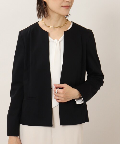 【デザイン】 裏地がなくストレッチ性があり着心地のよいジャケットです。 前ホックの位置まで少しV開きにすることで丸首ですがスッキリとした印象になっています。 ※ポケット数:横×2 【生地感】 コットン(綿)ベースのストレッチ性が高い素材を使用していて、着心地が良いのが特徴です。 ※裏地なし 消臭機能と、UVカット、接触冷感機能もついた機能的な素材です。 ※この製品は、消臭加工をしております。この効果は永久的ではありません。 ※この製品は、太陽光線中の紫外線(UV)を通しにくくします。この効果は永久的ではありません。 ※ダークネイビー(094)は青みの少ない暗めの濃いネイビーです。 【着こなしのポイント】 同素材のスカート(153-74420)とセットアップがおすすめです。 フレア、コクーン様々なワンピースとも合わせやすく上品なスタイリングになりおすすめです。 ********************** 【スタッフ着用コメント】 生地感:柔らかくストレッチのきいた素材です。 着用感(身長163cm Mサイズ):非常に柔らかい生地なので、きちんと感がありながらカーディガンのように軽く羽織れました。 コンパクトなサイズ感ですが、ストレッチがきいているので締め付け感も少なくてラクちん! ウエストは少し身体に沿うようなラインになっていて、前を開けて着てもきれいなシルエットです。 ********************** ※2021秋冬商品の一部より「レギュラーサイズ/トール&ラージサイズ」の商品番号と価格が統一となりました。 モデル情報:身長157cm 着用サイズ:02(M) 店舗へのお問い合わせ商品番号:153-44431 ●製品寸法: 00(SS):着丈48cm B89cm 袖丈52cm 肩幅36cm 01(S):着丈50cm B92cm 袖丈54cm 肩幅37cm 02(M):着丈51cm B96cm 袖丈54cm 肩幅38cm 03(L):着丈52cm B99cm 袖丈55cm 肩幅39cm 04(LL/トール):着丈53cm B102cm 袖丈56cm 肩幅40cm 42(3L):着丈55cm B106cm 袖丈54cm 肩幅41cm 44(4L):着丈56cm B110cm 袖丈54cm 肩幅42cm 48(6L):着丈58cm B118cm 袖丈55cm 肩幅43cm 備考:重量:02(M)約255g