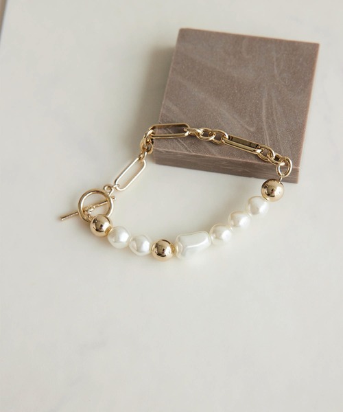 腕もとをラグジュアリーに演出。オンオフ兼用で着けられるのも魅力。【デザイン・シルエット】・メタルチェーンと変形パールビーズを組み合わせたリッチなブレスレット。・トグル式の留め具で着脱がしやすい。【カラー】・カラーによってパールの数が異なります。ゴールド(90):パール3つゴールド(91):パール6つ【スタイリングポイント】・袖をラフに捲くり上げてアクセントでプラスして。・存在感がるため、シンプルなスタイルにワンポイントで取り入れるのがグッド。※撮影時の光、お使いのモニター環境によって色の見え方が違う場合がございます。