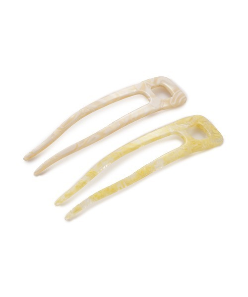 【一つ一つの柄が異なる2本セットのヘアフォーク】 【Design/Styling】 ニュアンスのある形状が目を惹くヘアフォークは、とても軽量なアセテート樹脂を使用しています。お団子などのまとめ髪やハーフアップのヘアアレンジとして、毛束に差し込むかんざしタイプの便利なヘアアクセサリーです。単品でもお使いいただけるよう柄が異なるのも魅力。夏ムードを盛り上げるイエロー、ブルーの2色展開です。 ※照明の関係により、実際よりも色味が違って見える場合があります。 またパソコン・スマートフォンなどの環境により、若干製品と画像のカラーが異なる場合もございます。予めご了承ください。 商品の色味は、商品単品画像をご参照下さい。 ※商品画像はサンプルのため、色味やサイズ等の仕様に変更がある場合がございますので、予めご了承ください。