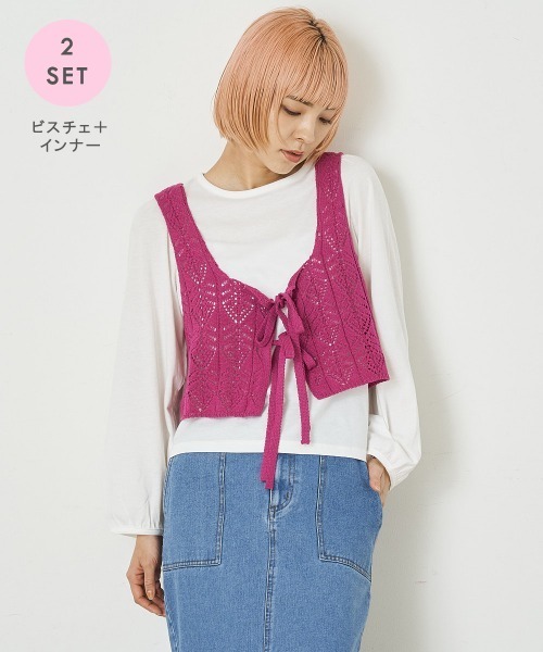◆嬉しい2点セット&前後2way着用が魅力的◆ ■デザイン カットソーとビスチェの2点セットアイテム。 透かし編みで軽やかな雰囲気のニットが 今年らしいデザインの仕様に。 前後着用可能な2way仕様なのも嬉しいポイント。 ひもで結んでいただくデザインが、 前から見ても後ろから見ても可愛らしく、 前後でイメージを変えることが出来ます。 カットソーのスリーブはボリュームを持たせた ボリュームスリーブで、腕回りもすっきり見え◎ ■スタイリング セットアイテムなので、セット着用がおすすめ◎ 単品使いももちろん◎ キャミソールなどのインナーの上に ビスチェをお召いただくのも◎ カットソーは一着で汎用性抜群。 デニムなどと合わせるとこなれカジュアルな スタイリングに仕上がります。 ■着用感 コットンを含むニット素材なので、 肌触り柔らかく滑らかです。 その日のスタイリングの雰囲気によって、 前後着用使い分けで表情を変えられるので、 着回しも楽しくなります。 …………………… 【カットソー】 透け感:なし 厚さ:普通 伸縮性:なし 【ビスチェ】 透け感:なし 厚さ:普通 伸縮性:ややあり ……………………