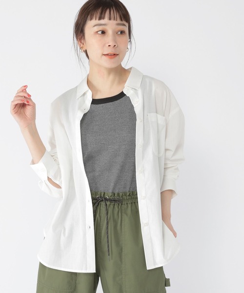 ーーーUV加工と接触冷感機能の付いた夏に着やすいシャツ。ナチュラルな表情のある素材感で体にまとわりつかず、清涼感のある仕様に。ーーーパンツにもワンピースにも合わせやすいちょうどよいサイズ感になってます。夏らしい爽やかなカラーリングでコーディネート自由自在の万能アイテムです。