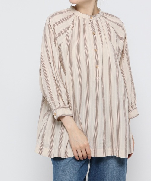 爽やかなストライプ柄で女性らしさを演出 柔らかく、肌触りのいいストライプ柄のスタンドカラーシャツ。 ふわっとしていて女性らしいシルエットで着ていただけます。 スカートにもパンツにもバランス良く合わせられる着丈もポイント。 シーズン通して長く活躍してくれます。 【ichi(イチ)】 「着て体に馴染み、色あせていくことで自分らしい色に変わっていく服、着続けることが喜びとなる服」 九州福岡での生活を拠点にして生み出されるブランド「ICHI(イチ)」。 着て洗うことでテキスタイルの表情や風合いの変化を楽しめる一着。 生地の変化と同時に、服が自分の体のラインに馴染む心地よさを感じてください。