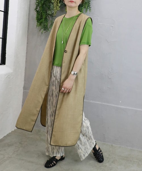 商品名:Sheson(シーズン)リネンライクパイピングジレ 商品番号:dd343057 商品説明:【2022SS】 ・アクセントになるパイピング仕様 ・軽いタッチのリネンライク素材 羽織るだけでスタイリングを上品な雰囲気にするロングジレ。 シンプルコーデに重ねるだけでスタイリングが完成します。 深めのサイドスリットで重くならず軽やかな抜け感をプラス。 ドライタッチのリネンライク素材で夏場も快適に着て頂けるアイテム。 *商品画像のお色は撮影環境やモニターによって、 実物と若干異なる場合がございます。 *他のサイトと在庫を共有している為、ご注文頂いた商品が欠品となる場合もございます。 *3,980円以上は送料無料(沖縄、離島は9,800円以上で送料無料)となります。 宅配便550円、離島1,210円、沖縄1,430円、メール便一律280円(離島・沖縄含む)です。 ------------------------------------------------------------------------- サイズ:Fサイズ(モデル160-BK/169cm- DBE) 平置き・実寸: ・着丈 112cm ・身幅 52cm ・肩幅 40cm ・アーム 26cm ※個体によって若干異なる場合がございます。 **生地詳細** 【裏地】なし【生地の伸縮】なし【生地の透け感】なし 素材:本体ポリエステル100%,パイピングポリエステル95%,ポリウレタン5% 製造:中国 カラー:ダークベージュ・ブラック