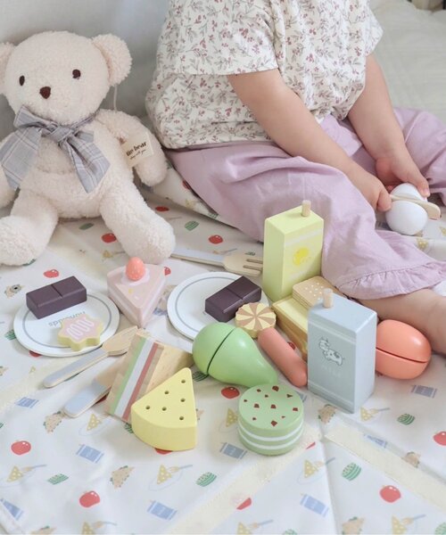 F.O.TOYBOX ピクニックセット_nunukids 「今日のピクニックには何をもっていこうかな?」 木のぬくもりとくすみカラーが可愛い♪ピクニックセットです。 広げるとシートになる可愛いピクニックバッグの中には、 気分がウキウキするおもちゃの食材がたくさん♪ 卵、リンゴ、ラフランスはマジックテープがついており、 ナイフでカットする遊びも楽しめます。 一つひとつ、手作りでナチュラルな風合いなので、お部屋に飾っても素敵です、 ※小さな部品がございます。誤飲にご注意ください。 【セット内容】 バッグ(広げるとシートになる)、丸ケーキ、 三角ケーキ、お皿×2、チーズ、サンドイッチ、 卵、リンゴ、ラフランス、オレンジジュース、 牛乳、食パン×2、チョコ×2、ソーセージ、 フォーク×2、ナイフ×2、丸クッキー、 六角クッキー、ビスケット パッケージ:30×20×18㎝ 対象年齢:4才以上(取れた時に小さなパーツ誤飲の恐れがあるため) (使用上の注意) 思わぬ事故ののもとになりますので、下記にこ注意ください。 ●保護者のもとで遊ばせてください。 ●転落の恐れのある環所、傾斜のある環所、火気のある場所では絶対に使角しないでください。安全な場所で遊んでください。 ●隙間には指を入れないでください。はさまれて怪我をする恐れがあります。 ●安全のため、破損、変形したおもちゃは使用しないでください。 ●投げたり、ぶつけたり、ふりまわすなど乱暴な遊びをしないでください。 ●各パーツにトゲやバリが残っている場合は、きれいに取り除き安全を確認してからご使用ください。 ●廃棄するときは、自治体の廃棄処理の指示に従ってださい。 ●高温多湿の場所、日光のあたる場所での保管はしないでください。 ●火気や暖房器具の近くでの使用、 保管は絶対に避けてください。火傷や火事の原因になります。 ●汚れを落とす場合は、水または薄めた中性洗剤を軽く含ませ、かたく絞った布で表面を拭き取ってください。 ●梱包材に使用してます袋、固定具は開封後すぐに捨てて<ださい。 ●商品をご使用される前に注意分や取扱い説明などをよく読んでください。パッケージ(箱)は捨てずに保管をしてください。 ●実際の商品とパッケージの写真、イラストが多少異なることがあります。またお買上時期によって同一商品のなかにも多少異なるものがこざいます。ご了承ください。 ~ 木のおもちゃについて ~ 手作りのため、小さなキズや塗装はげ、若干の色ムラ、 ボンドのはみ出しなどが見られる場合がございます。 また天然素材の特性上、一つーつの色目、木目、節、 サイズ、形状、隙間などに個体差があります。 木のおもちゃならではの味として風合いをこ理解の上、 お楽しみください。