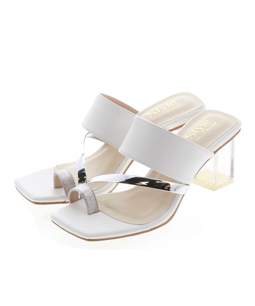 スクエアトゥとクリアのスクエア型ヒールが旬シルエットのトングサンダル。メタリック素材の斜めに流れるストラップが足をきれいに見せてくれます。 スタイリングしやすいシンプルデザインで、投入するだけでトレンドの足元に。 甲の太めベルトが足をホールドしてくれるので、ヒールの高さを感じにくく安定感も◎ クリアヒールが春夏らしく、涼し気な印象の大人スタイリッシュなアイテムです。 ※撮影は室内で行われており、ライティングにより実物と色味が少し異なる場合がございます。