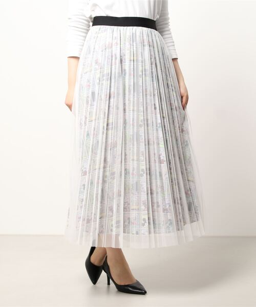 新宿エリアのLUMINEで展開されるディズニーコレクションシリーズ。 ミッキーのコミックアートを総柄にしたプリーツスカートはメッシュを重ねてさりげなく着られるミッキー柄のスカートです。 コミックの色を活かしたマルチカラーとシックにまとめたモノトーンの2色展開。 同素材のTシャツ(A0513UTS411)もおすすめです。