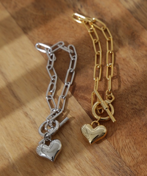楕円形チェーンにハートモチーフを組み合わせたブレスレット。コロンと揺れる立体的なハートモチーフが愛らしいポイントになります。Tバーで簡単に装着できる仕様。シンプルなデザインなので、シーズンレスでお使いいただけます。