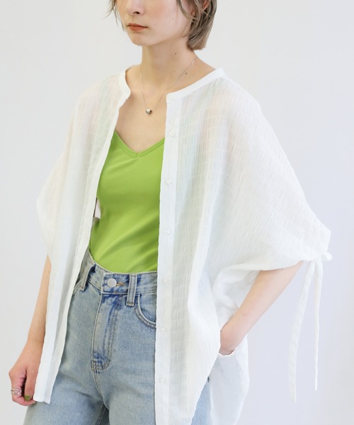 -point- & -styling-快適な着心地なのに着映えるドロストスリーブジャガードブラウスの登場!ルーズなオーバーサイズのシルエットに袖口のリボンでフェミニンな要素をプラスしたアイテムです。ふわりとエアリーな軽い質感で涼しく爽やかに着こなせます◎ヒップまで隠れる少し長めの着丈なので、タイトスカートに合わせたり、インスタイルでワイドパンツに合わせるクールなスタイリングもおすすめです。モードに着られるブラック、着まわしやすいホワイト、シーズンムード高まるブルーの3色展開でご用意しました。袖リボンオーバーサイズシアーブラウス----------------------------素材 ポリエステル95%・ポリウレタン5%----------------------------伸縮性 なし裏地 なし----------------------------※モニター・環境等により実際の商品と多少色味が異なって表示される場合がございます。 予めご了承をお願いいたします。=======================■袋梱包の為、染料による特有の匂いが抜けきれず、匂いがする場合がございますが不良品にはあたりません。 上記注意点での返品、交換はお断りします。ご了承の上お買い求めくださいませ。■本製品は生産過程におきまして色味、サイズ感等若干の誤差が出る場合がございます。予めご了承くださいませ。=======================【お買いものをお楽しみいただく為に!】▼商品のお気に入り登録完売カラーの再入荷通知や、ラスト1点の通知、セールの通知も受け取ることができます。▼ブランドのお気に入り登録新商品や再入荷など、いち早くブランドのお得な情報を受け取ることができます!