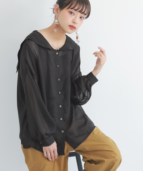 『印象的な佇まいをつくる。』 無駄のないシンプルなデザインとニュアンスカラーがポイント。 お洒落なエッセンスがぎゅっと詰まった印象的シアーシャツ♪ 大きめのセーラーカラーで後ろ姿までお洒落に魅せる。ゆったりとしたサイズのシルエットで、ボタンを開けて羽織としても着られます。 てろんと落ち感のある上品なシアー素材は、さらりとした肌触りの良い透け感のあるシフォン生地を使用。 程よい透け感が抜け感をプラスし、軽やかで薄手の生地感だから春夏の着用に最適です。 今、好きな物、興味あることを自由な発想で表現できる≪ n'OrLABEL ≫。 「実用性と機能性、そして遊び感覚」、多面性を楽しめるピュアでモードなデザインライン。 大人可愛く着られる≪n'OrLABEL≫セーラーカラーシアーシャツです。