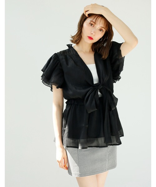 ~NICECLAUP 2022 Black collection~前後どちらが前でも着れるフェミニンブラウス。カラーにより素材を変えたアソートデザインで、それぞれに印象も変わります。少し透け感のある素材と腰まで隠れる少し長めな丈は夏の軽やかさと腰まわりをカバーし着やせ効果も◎袖はダブルフリルでフェミニンさと、華奢感を演出します。背中を開けた大人っぽい見え方やリボンを前に持ってきたデザインで印象も変わるので着回力も抜群。夏のお呼ばれコーデにもピッタリなナイスクラップ一押しのアイテムです。■ オススメスタイリング腰丈まであるデザインなので、パンツとの相性が◎デニムで合わせたカジュアルな着こなしやミニボトムと合わせるのもオススメです。夏らしい雑材小物を合わせることで、夏のブラックコーデが完成!-------------裏地:あり伸縮性:なし生地の厚さ:普通生地の重さ:普通-------------※サンプルでの撮影のため、実際のものと仕様や色が異なる場合があります。※室内、室外での撮影のため実際より明るく映っていたり、暗く映っていたりする場合がございます。※品質表示を必ずご確認下さい。【商品のお気に入り登録】完売カラーの再入荷や、ラスト1点のお知らせ、セールの通知を受け取ることができます。【ブランドのお気に入り登録】新作入荷や再入荷情報など、ブランドの情報をいち早くお届けします。ぜひご登録ください♪