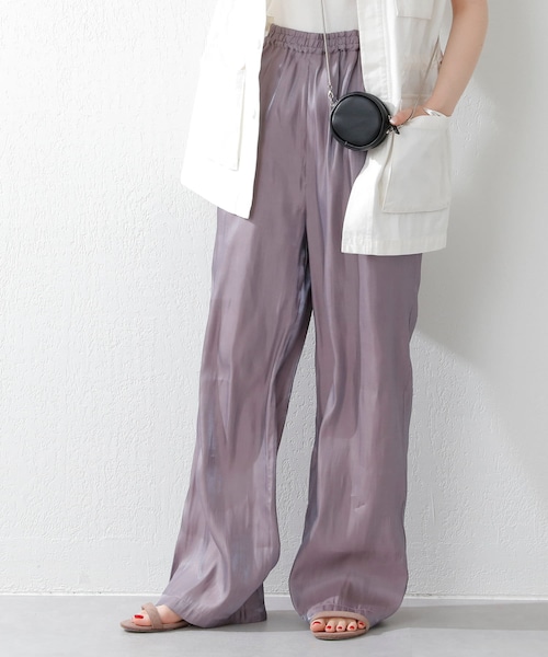 【2022 Spring&Summer Pre Order】 ♦程よい光沢と透け感が上品なイージーパンツシアー素材で夏でも涼しい、リラックス感のあるパンツ。ウエストゴムで、内側は調整可能なドロスト仕様なのでストレスフリーな履き心地。歩くたびに裾部分の透け感が女性らしさを演出。膝まで裏地が付いているので、アンダーウェアのラインを拾い過ぎず安心して着て頂けます。・光に当たるたびに輝く光沢感が美しい1枚・ワイドシルエットで体形カバーも◎・さらっとしていてシーズンレスで着用できる素材感<おすすめスタイリング>バックVシアーニットプルオーバー(SNZ1021405A0003)や、ノーカラーミリタリーベスト(SNZ1021207A0002)との合わせがおすすめです。- - - - - - - - - - - - - - -透け感:裏地以外の部分のみややあり裏地:あり(※ひざ丈までとなります)伸縮性:なし光沢感:あり生地の厚さ:やや薄い取り扱い:弱いドライクリーニングができる- - - - - - - - - - - - - - --------------------------------------------------------------------------------- 【♡をクリックでお気に入り登録】完売カラーの再入荷やラスト1点の通知、セールの通知を受けとることができます。-------------------------------------------------------------------------------- ※撮影環境により、光の当たり具合で色味が違って見える場合があります。あらかじめご了承下さい。※画像はサンプルの為、実際にお届けする商品と仕様が異なる場合がございます。※アイロンは、当て布をしてかけてください。※この商品は、糸及び編組織の性質上、引っ掛け・引っ掛かり易い性質をもっております。※着用時はベルト・バッグ・アクセサリー・周囲の壁など、表面の粗いものとの摩擦や引っ掛かりにご注意ください。※クリーニングの際にも、他のものとの引っ掛かりにご注意ください。※クリーニングの際は、取扱い絵表示をご確認ください。※摩擦(特に湿った状態での摩擦)や、汗や雨などで濡れた時は他の衣料や、下着(特に白)物に色移りする場合がありますので、十分ご注意下さい。※クリーニングの際は、多少色落ちすることがありますので、出来るだけ単品洗いをおすすめします。また、他の淡色物に色移りすることがありますので、すみやかに処理(脱水、乾燥)するようお願いいたします。※必ずドライクリーニングをしてください。水洗いは風合い、光沢の変化、縮みの原因になりますので、避けてください。※直射日光や蛍光灯の長時間の照射により、色あせることがあります。※雨や汗など水に濡れることにより光沢がなくなったり、シミになることがあります。※デリケートな素材ですので、極度な力が加わると、縫い目が開いたり目寄れ(糸がずれて、生地の目が開く)する性質をもっています。