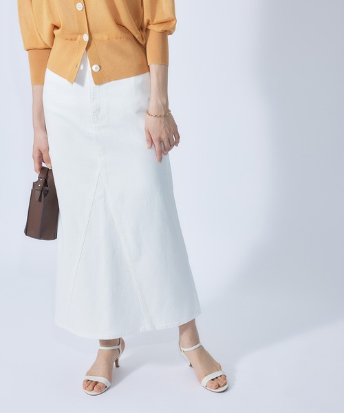 【素材】 コットンに見える表面感ですが、ストレッチが抜群の万能素材。 自然に体に馴染むデニムスカートです。 【デザイン・シルエット】 セミフレアマキシスカートは、少しハイウエストでデニムパンツから切り出したディテールのモダンデニム。 【カラー】 アイスブルー、白の2色展開 【スタイリング】 ハーフスリーブジャケットやブレザー合わせがオススメです。 今季はフェミニンなブラウスなどと合わせてヘルシーな抜け感も楽しめます。 ---------------------------- 透け感:なし 裏地:なし 伸縮性:あり 光沢感:なし 生地の厚さ:中肉 ポケット:あり 洗濯方法:洗濯機可 開き方:ファスナー ---------------------------- 【モデル情報】 モデル身長:167cm着用サイズ:36(ホワイト)38(ブルー系) ※画像の商品はサンプルです。 実際の商品と仕様、加工、サイズが異なる場合がございます。 ※撮影場所やライティング、お使いのモニター環境によって色の見え方が異なる場合がございます。 ※商品のカラーは画像の色味をご参照ください。動画は仕様説明のため、色味が実物と異なる場合がござます。