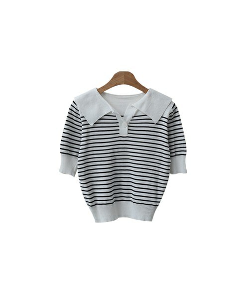 大人ガーリーなセーラーカラーの半袖ボーダーニット。 トレンドライクなクロップド丈が◎ スカートからデニムまで色んなボトムスに相性抜群でとても使いやすい1枚です♪