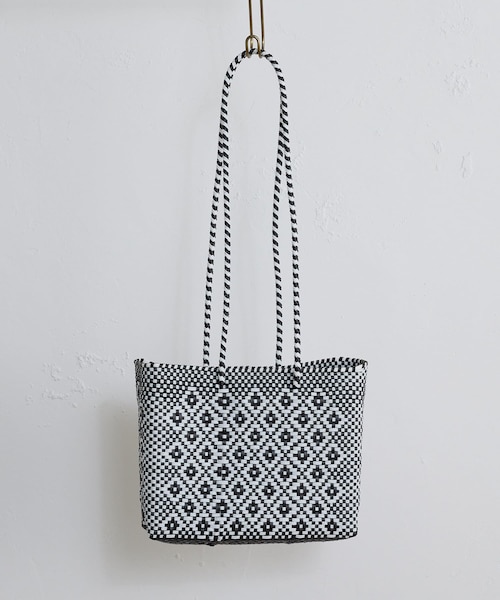 ★OUVRAGE CLASSE 2022SS COLLECTION★Moon Birdより、大人気のメルカドバッグが登場。「メルカドバッグ」とはスペイン語で「マーケットバッグ」という意味でペットボトルなどをリサイクルしたPVCの糸を使いメキシコで1点1点手編みで作られています。手編みならではの個体差のある表情が魅力。PVCのカジュアルな素材感と幾何学模様の編み地が特徴的。やや持ち手が長めのデザインなので、肩掛けしてお使いいただくのがおすすめです。500mlのペットボトルがしっかり入るくらいのサイズ感でちょっとしたお出掛けなどにぴったり。◇COLOR◇BLACK×WHITE:ややホワイトの面積が多く、夏らしく爽やかな定番のモノトーンカラーWHITE×GOLD:くすみゴールドとホワイトのカラーが絶妙な季節感あふれるカラー【Moon Bird/ムーンバード】メキシコ生産に特化した「遊び心」を提案するブランド。Moon Birdとは、月明かりに照らされ、キラキラと自由に飛んでる鳥を意味します。自由に自分らしく「心を解放するエスケープ・シーン」を楽しんで頂けるアイテムをリリースしています。※お取扱い上のご注意※アナログなリサイクル方法の為、テープに小さな砂などが混入している場合がございます。また、ペットボトルなどの配合具合によりテープの色目が変わる事があります。手作業の為、テープの接着箇所が変色している場合がありますが特性上、上記不良品ではございません。予めご了承くださいませ。●ハンドメイドにつき、1点1点サイズや柄・縫製などに個体差が生じる場合があり、多少の織傷やノリ跡が生じる場合があります。