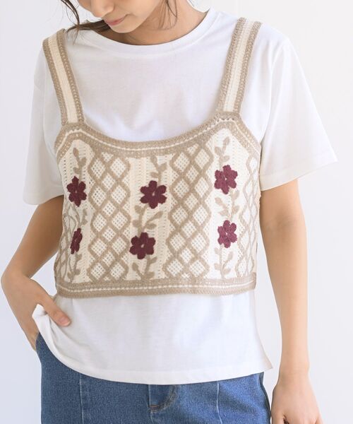 レトロ可愛いクロシェ風ベストとTシャツのセットアイテム かぎ針風のニットにお花の刺繍を施したレトロな風合いが可愛いベスト。 ビスチェデザインで女性らしいスタイリングに仕上げてくれます。 コーデのバランスがとりやすいコンパクトな丈感。 インナー付きなのであれこれ悩まなくてもレイヤードスタイルが簡単に楽しめます。 シンプルな白Tシャツは他アイテムとも合わせやすく、持っていると便利♪ ベストはブラウスやシャツワンピとも相性が良く、単体でお使いいただいてもOKです。 このセットでコーデの幅が広がること間違いなし! 裏地なし カットソーのみ伸縮性あり 薄手 編み加減や染めの具合でデザインやサイズ等異なる場合もございます (アウター・インナー) 洗濯:手洗い可 ▼お気に入り登録でお得がいっぱい▼ ~商品をお気に入り登録~ 再入荷・ラスト1点・セールの通知を受け取ることができます! ~ブランドをお気に入り登録~ 《rps》の新商品・再入荷情報をいち早くお届け!