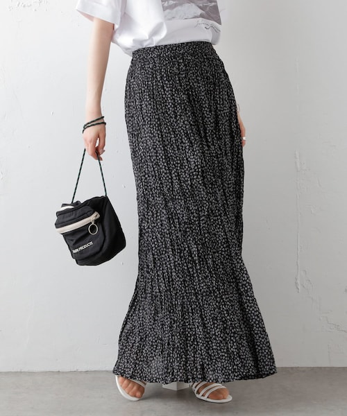 ピュアルセシン 2022 spring collection【Loose andclassical】リラックス感のあるルーズな着こなしや、今シーズンらしいミニマムでユーティリティな要素と素朴かつ巧みなハンドクラフト的なものとの融合させたスタイリングの提案◇ふんわりと春らしいエアリーなスカート◇NO:251400100 クリンクル加工小花柄スカートと同型です。●同シリーズセットアップ対応NO:251310301:クリンクル加工小花柄ブラウスNO:251720211:クリンクル加工小花柄ワンピース●デザインクリンクル加工で縦にシワ感を加工し、すっきりとしたシルエットのロングスカート。単色の小花柄はランダムなドットにも見えて面白く、モノトーンなので飽きずに着ていただけます。ウエストはゴムなので、着る位置やウエストを折って、長さが調節が叶います。表は薄手な生地を使用しているので、動くと少しふんわりと揺れます。軽く、エアリーなスカートは春らしいコーディネートに欠かせないアイテムです。●カラー展開通年使いたくなる、シロ、クロの2色展開。●素材柔らかなシャツ生地です。表地は、やや透け感のある軽い素材感。裏地はサラッとしたカットソー生地です。●スタイリング同じ生地のブラウスとセットアップのスタイリングは、ワンピースの様に見えてオススメです。スウェット合わせでカジュアルにも、ニットやブラウスを合わせて綺麗めなコーディネートも◎また、すっきりとしたシルエットのスカートなので着丈の足りないワンピースの裾見せにも使えます。============================透け感:ややあり裏地:あり伸縮性:なし光沢感:なし生地の厚さ:薄手【スタッフコメント】年齢:30代後半/身長:154cm/普段着用サイズ:Mサイズサイズ感:ウエストのゴムが柔らかく着やすいです。やや長めなので1回折ると丁度良かったです。素材感:生地が軽く、動くとなびきます。===============================※クリンクル加工は永久的ではございません。※撮影場所やお使いのモニター環境により若干お色味が異なる場合がございます。特にロケの撮影では明るく見える傾向にございます。