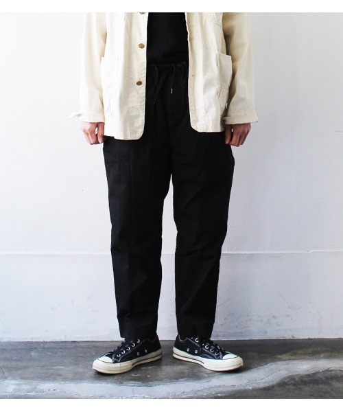夏場に快適なワイドシルエットのイージーパンツです。素材はCOOL MAXを使ったトップのグレーとピマコットンをブレンドしたウェザー、リップストップの3素材。シャツウェイトの涼し気な素材です。定番のスリムイージーパンツをデザインベースにフロントにタックを入れて、ヒップ~ワタリにややゆとりを持たせ、膝から裾にかけて緩やかにテーパードしたゆとりのあるシルエットです。【A VONTADE】ア ボンタージ「古きよきアメリカ、ヨーロッパのワーク、ミリタリー、スポーツを感じる素材、縫製技術、ディテールをソースに、現代に合うシルエットやデザインの再構築」をコンセプトに2003年にスタート。 素材の持つ匂いを生かす事を第一に考え、それに見合った縫製技術、ディテール、付属を当て込んだミニマルデザイン+αで、ワードローブにいつまでも残る物作りを目指してます。