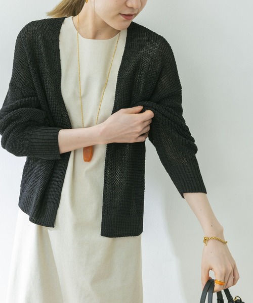 【夏の強い味方!リネン混が嬉しいガウンカーディガン】軽い着心地のリネン混素材が夏らしいカーディガン。フロントボタンを付けないことで、さっとラフに羽織りやすいデザインにしています。コーディネートに合わせやすいGREGE、BLACKの2色展開で、GREGEはほんのりメランジ調の馴染みやすいカラー。アイテム問わず羽織って頂けるバランスの良い着丈の1枚です。COORDINATE夏の定番ワンピースや、ハイウエストボトムとの相性も抜群。合わせるカラーも問わずお使い頂けます。※商品画像は、光の当たり具合やパソコンなどの閲覧環境により、実際の色味と異なって見える場合がございます。予めご了承ください。※商品の色味の目安は、商品単体の画像をご参照ください。-----------------------------透け感:ややあり伸縮性:ややあり裏地:なし光沢:なしポケット:なし-----------------------------