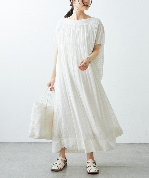 ピュアルセシン 2022SS collection【classical fragrant】 ◇1着でスタイリングが決まる小花刺繍ワンピース◇ ●商品のお気に入り登録 クーポンやタイムセール、再入荷通知やラスト1点などお得な情報を受け取ることができます。 ご登録をお忘れなく◎ ●デザイン ピュアルセシンらしい小花柄の刺繍を施した、フェミニンなワンピース。 ナチュラル感を抑えるレーヨン混の生地で仕上げています。 胸上のキュッと寄ったギャザーから生まれるドレープは動きを出し、エアリーなシルエットを作ります。 フレンチスリーブの袖口は気になる二の腕をしっかりカバーし華奢見え効果も。 涼し気で可愛らしい夏にオススメしたい1着です。 ●カラー展開 ホワイト/ベージュの2色展開 ●素材 レーヨン混のツルっとした生地を使用したワンピースです。 透け感があり、シーズンライクなスタイリングに仕上げます。 ●スタイリング ペチコートを入れ、1枚でサラッと着用するのがオススメ。 ワンピースがゆったりしているので、パンツを合わせる場合は細身シルエットのものが◎ =============================== 透け感:あり 裏地:なし 伸縮性:なし 光沢感:なし 生地の厚さ:薄手 【スタッフコメント】 年齢:20代前半/身長:157cm/普段着用サイズ:Mサイズ サイズ感:身体の泳ぐゆったりしたサイズ感です。 素材感:さらりとした肌触りでとても快適です。 =============================== ※撮影場所やお使いのモニター環境により若干お色味が異なる場合がございます。特にロケの撮影では明るく見える傾向にございます。 ※予約商品はサンプルで撮影をしております。若干の仕様が変更になる場合がございますので予めご了承の上ご注文くださいますようお願いいたします 。