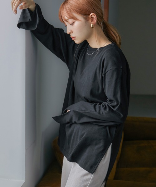 オールシーズン使えるシンプルなロンT。 長めの袖にはスリット入り。 ボディはオーバーサイズの作りで、ストリートな雰囲気がトレンドライク。 メイン使いはもちろん、レイヤードスタイルにも活躍する優秀アイテム。 ※濃色は淡色と一緒に洗わないで下さい。 洗濯後は濡れたまま放置しないで形を整えて直ちに干して下さい。 乾燥機のご使用はお避け下さい。 蛍光増白剤入りの洗剤のご使用はお避け下さい。 アイロンをする場合は、あて布をご使用下さい。 この製品は汗、水、摩擦により色落ちや色むらが生じる場合がございますのでご注意下さい。 【備考】 ・伸縮性:あり ・透け感:ホワイトのみあり