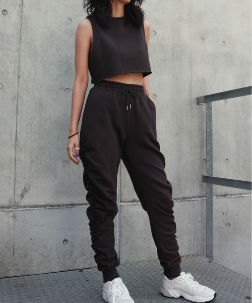 【デザイン】 SET UP対応! 大人気デザインの春夏ver! サイドシャーリングで自然にたるむのでシルエットがばっちり決まる!! ハイウエストと全体の細めシルエットでスタイルアップ。 同色のさりげないロゴ刺繍でストリート感をプラス! ウエスト部分はゴムでらくちん。紐付きです。 【コーディネート】 同生地のTOPSでセットアップがおすすめ!!! スウェットショートタンク 裏毛ブラタンク アウターはジャケットやシャツなど襟付きシックなアイテムでバランスをとるのが今年っぽい♪ ********************** 透け感:なし 裏地:なし 伸縮性:ウエストはあり(ゴム仕様) 生地の厚さ:普通 **********************