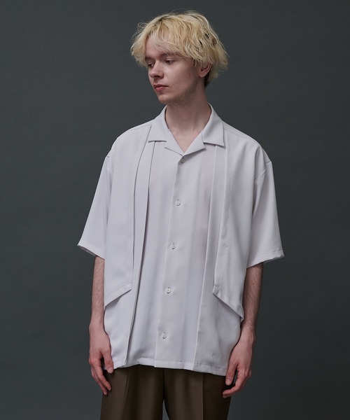素材清涼感のある組織とドレープ性に富んだダブルクロス生地。さらに防シワと接触冷感の機能付きでマシーンウォッシャブル素材になるので、SSシーズンに重宝される生地になります。デザインインナーをを重ねているようなダブル前立て仕様でフラップディテールを採用しているので、他のアイテムとスタイリングしなくても一枚で着用しても決まる半袖シャツになります。お手入れ方法洗濯機使用可
