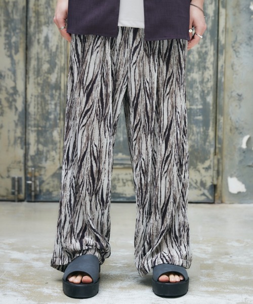 Casper John 2022 SPRING and SUMMER Collection -sortir- 【Graphic pleats slacks/グラフィックプリーツスラックス】 ◆素材特性 インパクトの強いグラフィックプリーツを使用 プリーツならではの独特なドレープ感に モノトーンコーディネートにも馴染むグラフィックが モードなスタイリングに溶け込みます。 ◆シルエット プリーツパンツには珍しいハイテーパードワイドシルエット なびきやすい素材をシルエットでまとまりを作り メンズでも使いやすいシルエットに仕上げました。 ◆デザインディテール トレンドの兆しのあるプリーツパンツを シンプルで綺麗な印象で完成させた シルエットにまとまりを出すことで 柄のインパクトを馴染みやすい仕上げに 裾を強く絞ることでボリュームのあるトップスで合わせても 野暮ったくならない着回しの効くデザインです。 《BRAND CONCEPT》 CREATIVE / MODE / URBAN をコンセプトに、 トレンドに敏感な都会人、 常に新しいファッションを求める方に、 遊び心を追及した創造性の高いモードスタイルを提案する。