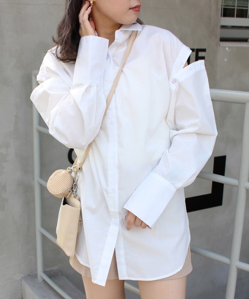2023 SS 春夏アイテム 【シンプルだからこそ使いやすい。今が旬のWEB限定のストライプシャツ。】 2WAYでマルチに着こなせるシャツは今話題。ボタンで表情を変えられる優秀アイテム。 ▼Design ・しっかりとした生地感が大人レディな雰囲気◎ ・合わせやすいオフホワイトの無地と人気のストライプがロングシーズン活躍。 ・シャツにも、ノースリにも肩開きにも。。。! ・前後差のあるラウンド裾デザイン。 ・ビックシルエットが女性らしい華奢さを演出。 ▼Fabric ・ハリ感のある生地で仕立てているので、普段使いはもちろん。オフィスでも◎ ・ポリエステルを使用しているのでシワになりにくく、保管しやすい。 ・コットン素材も使用しているので、優しい肌触りで着心地快適。 ▼Styling ・一枚で【1221-300011 デニムワイドパンツ】などのデニム合わせで大人カジュアルに。 ・【1221-300016 共ベルト付トレンチミニスカート】や【1221-300129 台形スカート】のようなミニ丈ボトムでかわいらしく。 ・【1221-300010 スリットマーメイドスカート】などのマーメイドシルエットにインして大人レディな印象に。 ・キレイめな【1221-300207 サイドギャザーナロースカート】のようなナロースカートとの合わせでオフィスコーデにも。 ・どんなアイテムにも合わせやすいので、お持ちのお洋服でコーデの幅が広がる1枚です♪ ----------------------------------------- 【以下ピンク/ストライプ参考。カラーにより多少の誤差あり】 ・透け感:やや透ける ・伸縮性:なし ・生地の厚さ:薄い ・裏地:なし ----------------------------------------- 【スタッフ着用コメント】 身長159cm WEBでしか買えないマルチで使えるシャツは、一枚持ってくととっても便利◎ トレンドの肩開きシャツは着るだけで旬になれるおすすめアイテム! 釦を閉めれば、きちんと感の出るキレイめシャツとしても使えるので、 使い回し抜群です◎