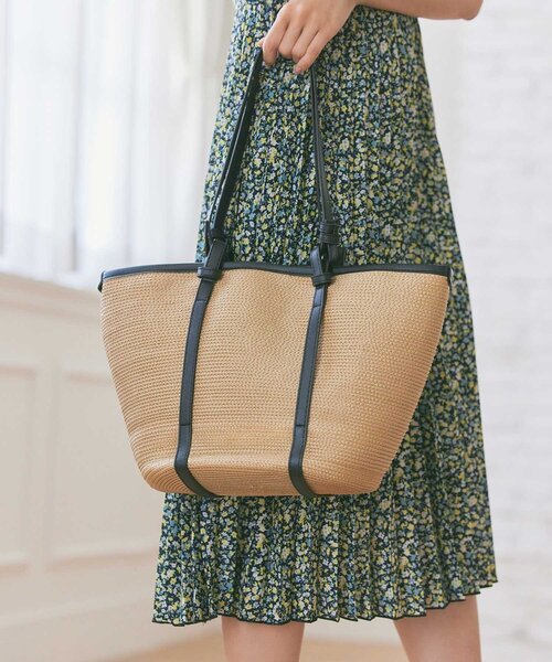 【My style is...掲載】【Dress me up掲載】 夏らしく上品な印象の雑材(ブレードテープ)をバスケット調に仕上げたトートバッグ。 【デザイン】 春夏らしい素材感が、シーズンムード漂うバスケットトートバッグ。 普段使いのしやすい大きめのサイズ感に、フェイクレザーを組み合わせキレイ目な印象に。 ハンドルは長めに設定しているので、しっかりと肩にかけられます。 口元はマグネット仕様、裏地付きで中の物が見えないので持ち運びも安心。 ※ポケット数:内側×1 ※長財布、500mlペットボトル収納可能 【素材】 雑材(ブレードテープ)をらせん状に縫製して組み上げフェイクレザーと組み合わせた大き目のトートバッグ。 店舗へのお問い合わせ商品番号:C71-14053 ●製品寸法: 00:高さ25.5cm 幅(上部)35cm 幅(下部)27cm マチ14cm 持ち手上がり27cm 備考:重量:約370g