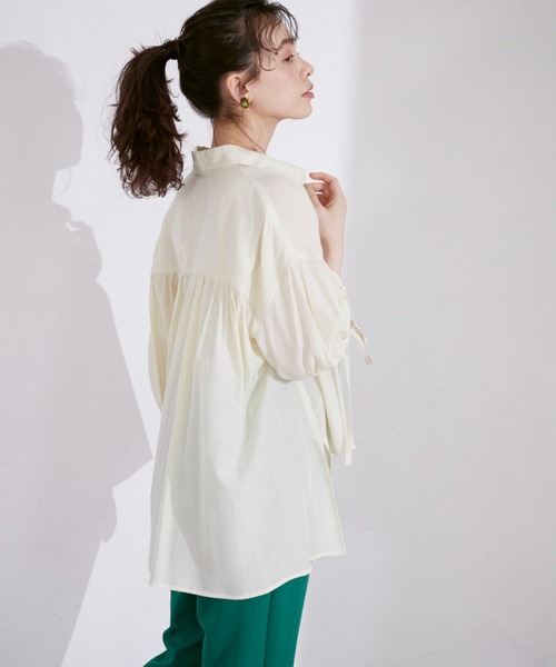 柔らかで肌触りの良い素材を使用したボリュームスリーブブラウス。ボリュームスリーブは袖口にゴムを入れ、たくし上げても止まる仕様にしています。前後差を大きくし抜き襟でも着用可能です。袖口につけた杉綾テープリボンがカジュアル感をアップさせます。・水洗い可■サンプル撮影商品■こちらの商品はサンプルでの撮影となっております。実際の商品とは、商品情報(生産国、色味、上代、納期など)が変更になる場合がございます。予めご了承ください。